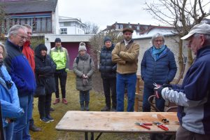 Man kann schon sagen, es waren die wirklich Unerschrockenen, die sich trotz Kälte zum Obstbaumschnittkurs im Pfarrgarten St. Alto eingefunden haben. Und es waren gar nicht so Wenige. Während die Gartenpfleger sofort die Sträucher vor dem Pfarrhaus geschnitten und ausgelichtet haben, wurden die Kursteilnehmer zunächst in das richtige Werkzeug für den Obstbaumschnitt durch Rainer Schäfers eingewiesen. Erste Einblicke in Schnitttechnik, in das Wo, Wann und Wieviel erfuhren die Interessierten an einer Kornelkirsche, einem Strauch vor einer Außenmauer. Hier wurde auch gezeigt, was es mit dem sog. Ableiten auf sich hat und wie Baum oder Strauch reagieren, wenn beim Schnitt nicht darauf geachtet wird.