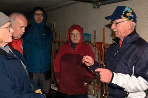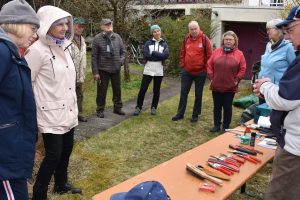 Für Herrn Schäfers steht am Anfang jeden Kurses die Werkzeugkunde. Er stellte dabei etwa die Scheren verschiedener Hersteller und Ausführungen gegenüber. Aus welchem Material ist die Klinge, ist sie auswechselbar und ist sie vielleicht auch für große, aber auch kleine Hände erhältlich? Auch die anderen Werkzeuge, Astschere, Baumsäge, Teleskop-Astschere und Hippe wurden auch im Vergleich der Vor- und Nachteile, wie z.B. Handhabung, mögliche Nutzungsdauer aber auch Preis vorgestellt. Die Entscheidung über die Werkzeuge bleibt jedem selbst überlassen. Zwingend notwendig ist aber die Einhaltung der Sauberkeit bei ihrem Gebrauch. So sollen die Werkzeuge regelmäßig vor Beginn des Schneidens mit Desinfektionsmittel oder auch Arzneialkohol desinfiziert werden, um eine Übertragung von Krankheitserregern wie Pilz- oder Baumkrebs zu verhindern. Im Winter sollte an die Pflege gedacht werden. Säuberung und leichtes Einölen erhalten die Leichtgängigkeit eines jeden Werkzeuges.