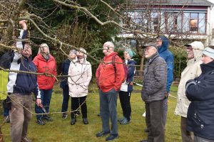 Die Regenpausen in der Garage wurden gut genutzt, um die Fragen der Teilnehmer zu beantworten. Was genau ist eine Baumscheibe, kann ich Blumen darauf pflanzen? Düngung war ebenso ein Thema wie die Behandlung von Säulen- und Spalierbäumen und was mache ich mit den vielen „Wasserschossen“, die senkrecht in die Höhe wachsen?