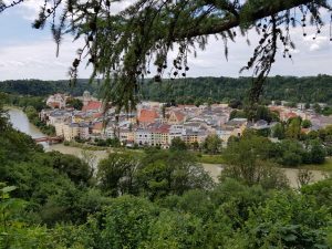 Zu Mittag wurde im Huberwirt oberhalb von Wasserburg gegessen, auf der Terrasse wegen des schönen Wetters. An meinem Tisch waren alle mit dem gewählten Essen sehr zufrieden. Gleich neben dem Huberwirt konnte man sich bei einem wunderbaren Blick auf Wasserburg und die Innschleife ein wenig die Füße vertreten.