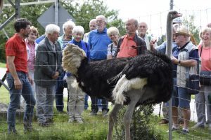 Und schon gings zum 2. tierischen Hof, dem Straußenhof Chiemgau in Schnaitsee. Jeder kennt Straußenvögel aus dem Fernsehen, vielleicht aus dem Tierpark oder sogar aus dem Urlaub, aber in echt danebenzustehen, ist es doch sehr beachtlich, wie groß so ein Strauß ist. Wir erhielten bei der Führung und später bei sehr gutem Kuchen und Kaffee viele Informationen zu den großen Vögeln. Wie etwa, dass Strauße als Wildtiere betrachtet werden, im Gegensatz zu den Alpakas, die als Nutztiere angesehen werden.